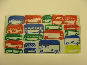 Keith’s print is titled ‘Buses’ and is also a limited edition coloured etching. It is a simple, playful work showing 21 buses in blue, red, green and yellow – a perfect image for inhabitants of a city proud of its award-winning bus service, especially at a time when trams are looming! It is priced £50 for an unframed copy and is taken from an edition of 30.